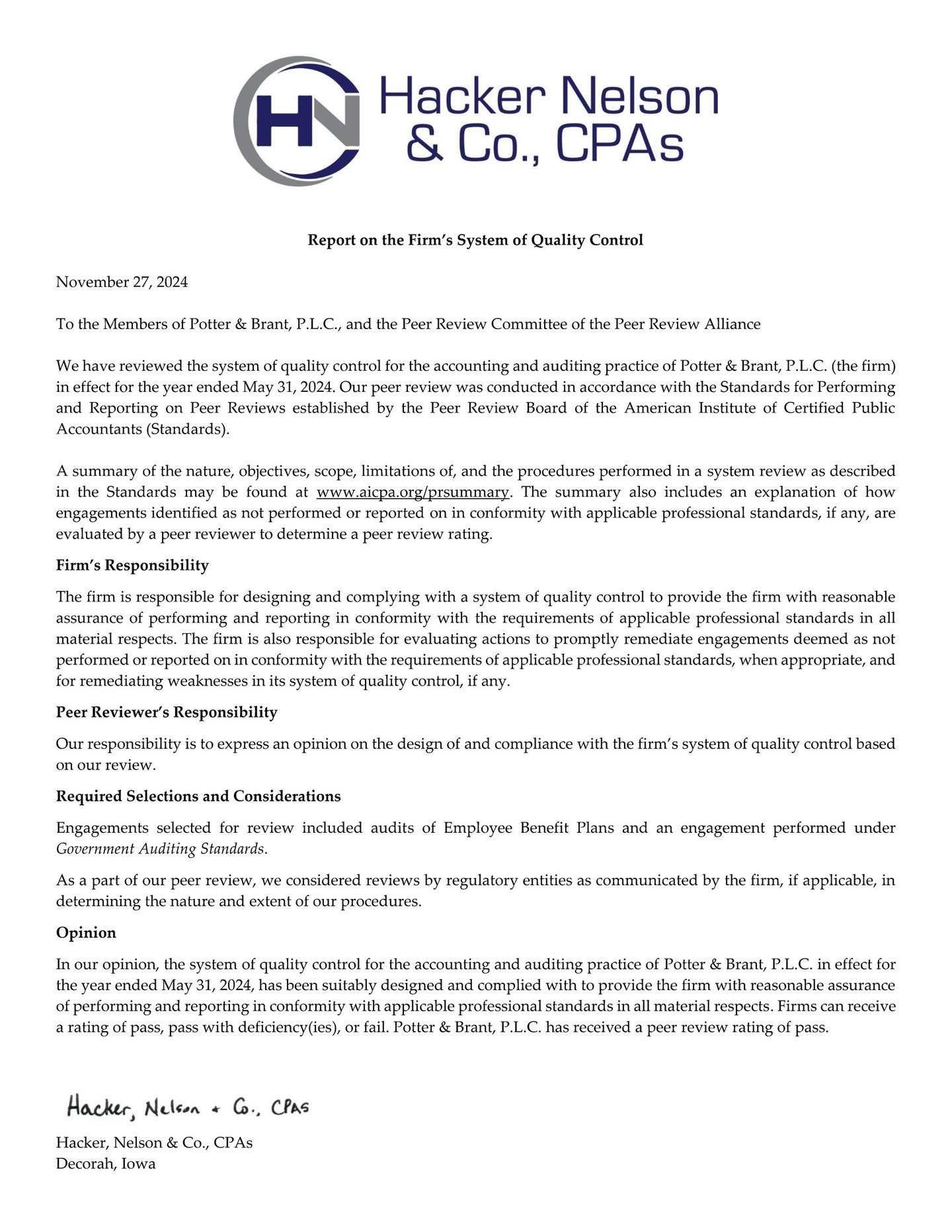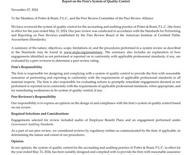 A Peer Review is an external, periodic review of the firm's accounting and auditing practice and system of quality control. It's essentially an audit of the auditor, conducted by another qualified CPA firm. In essence, peer review serves as a mechanism for self-regulation within the CPA profession, fostering quality, accountability, and public trust. Our firm has proudly received a pass rating with no deficiencies for over 25 years!